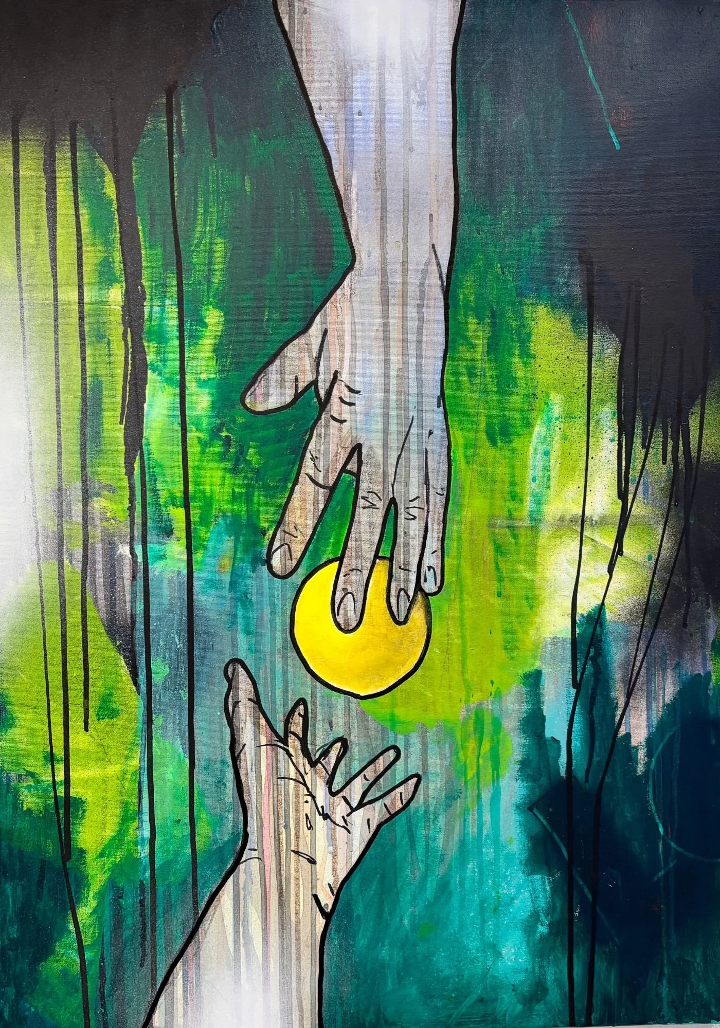 At gribe hinanden er at være opmærksom. Når den ene taber, bliver den andens bevægelse afgørende. Det handler ikke om styrke, men om tilstedeværelse. I et øjeblik kan et greb forhindre faldet, og i det greb opstår tillid. Værket kredser om det stille ansvar vi har for hinanden – at være der, netop når balancen svigter.